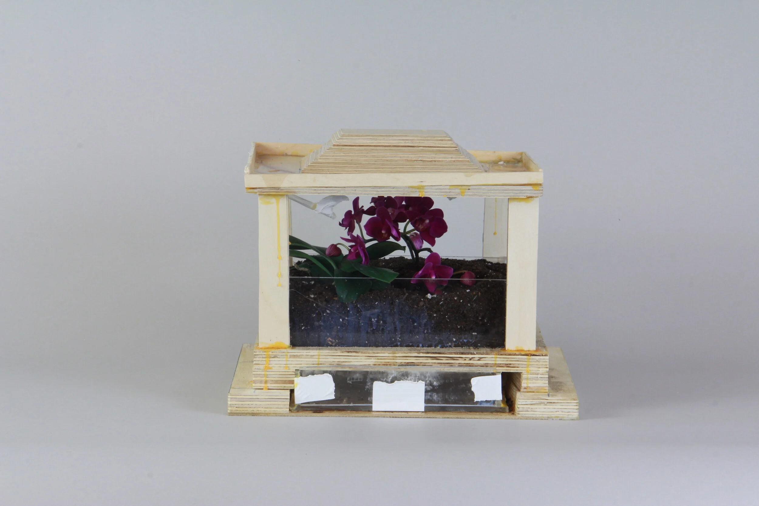 A prototype for a small garden designed in a class at the School of Design and Media Arts at the University of California, Los Angeles. Pour water over the top which runs into tubes that slowly distribute the water. Found that you could use ice cubes for even slower water distribution. Underneath the soil this is a mesh in which unused water can pass through into the drawer below to limit the amount of water wasted.